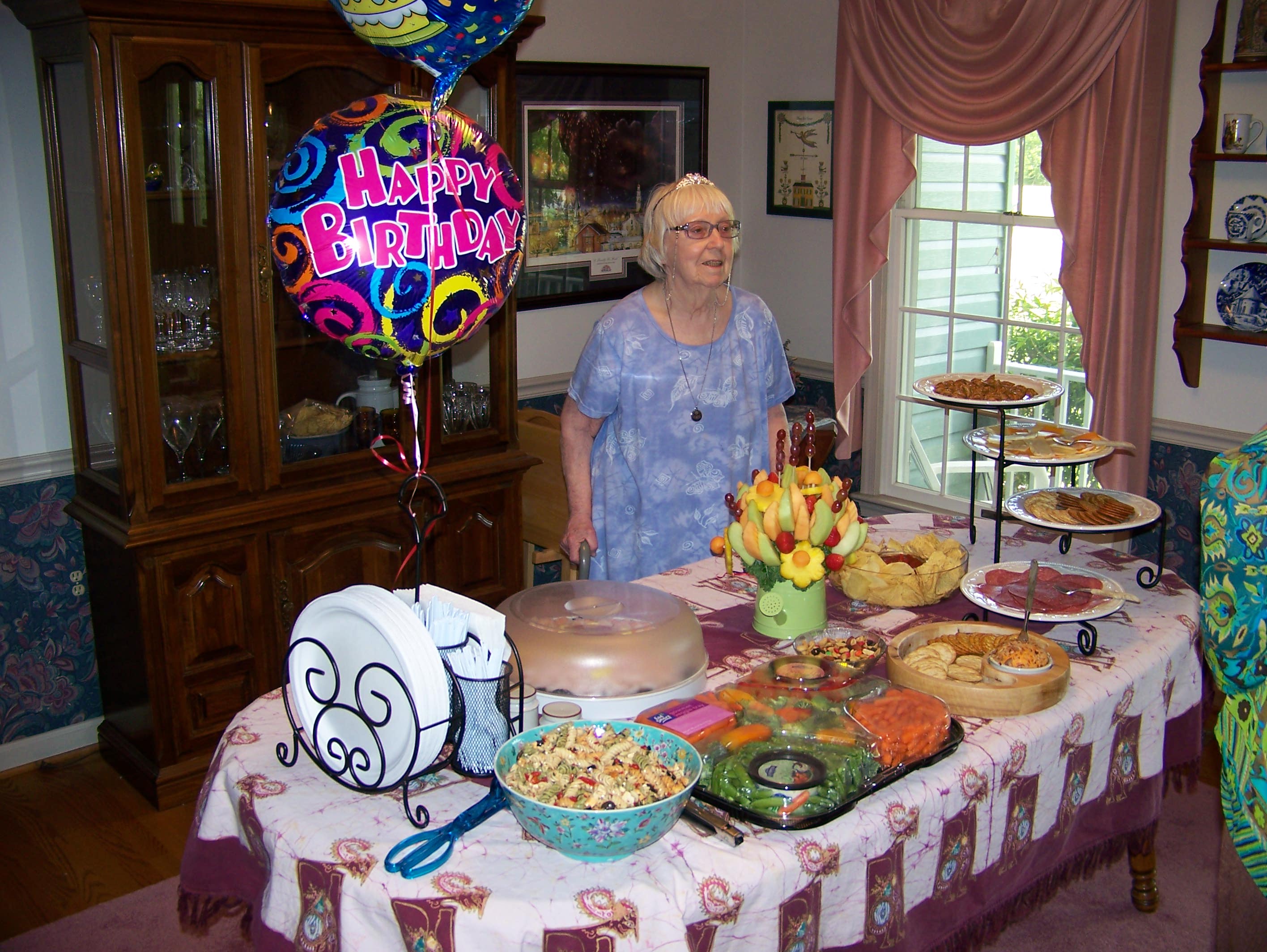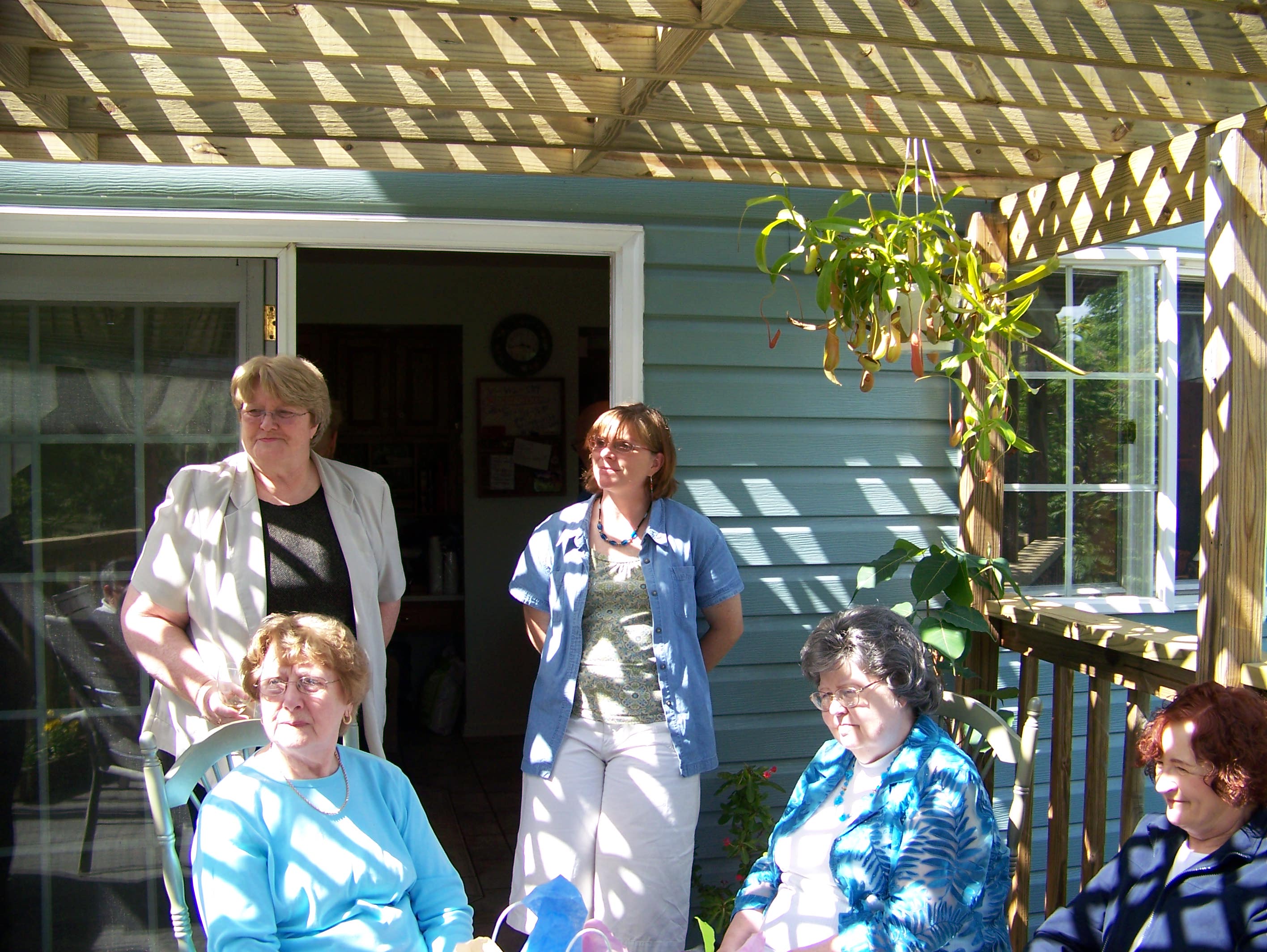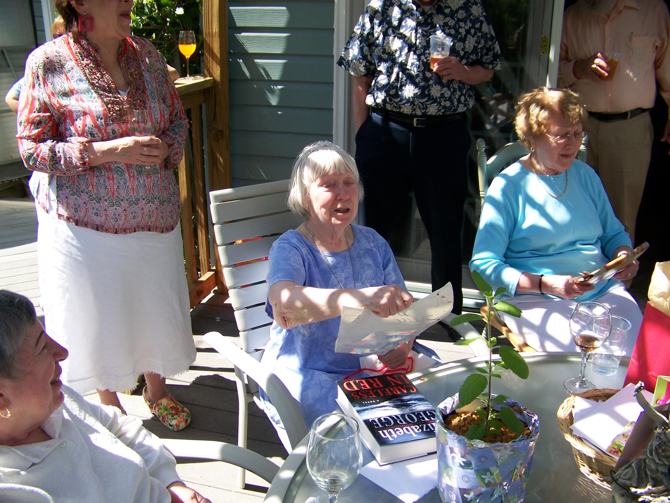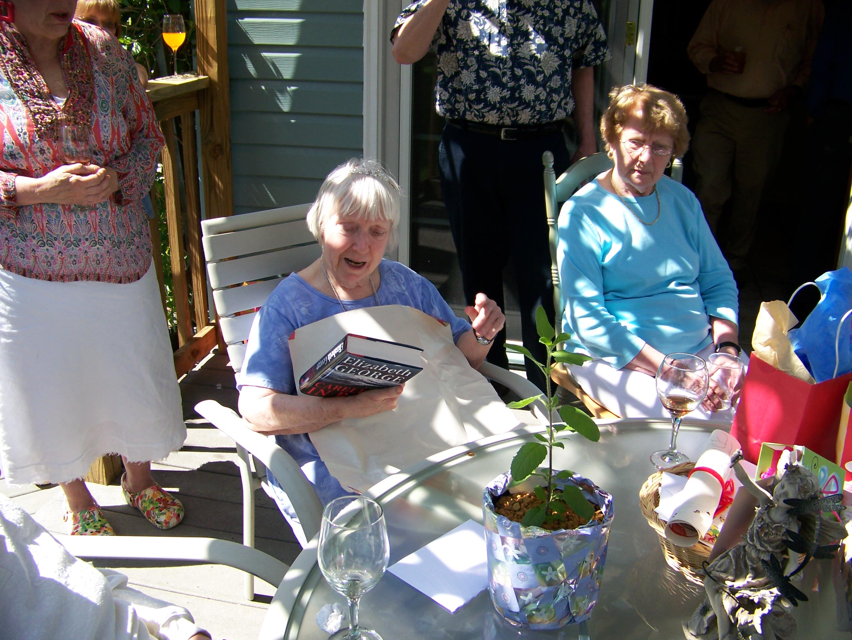 A tour of the garden. Let's get this party started, cause all my rowdy friends are coming over tonight. And Mom opens the gifts. The Hosts really have a green thumb. The neighbors have a wild duck taking to the swimming pool. Mom with friends Mom with Hosts Mom with us. We Love You Mom |