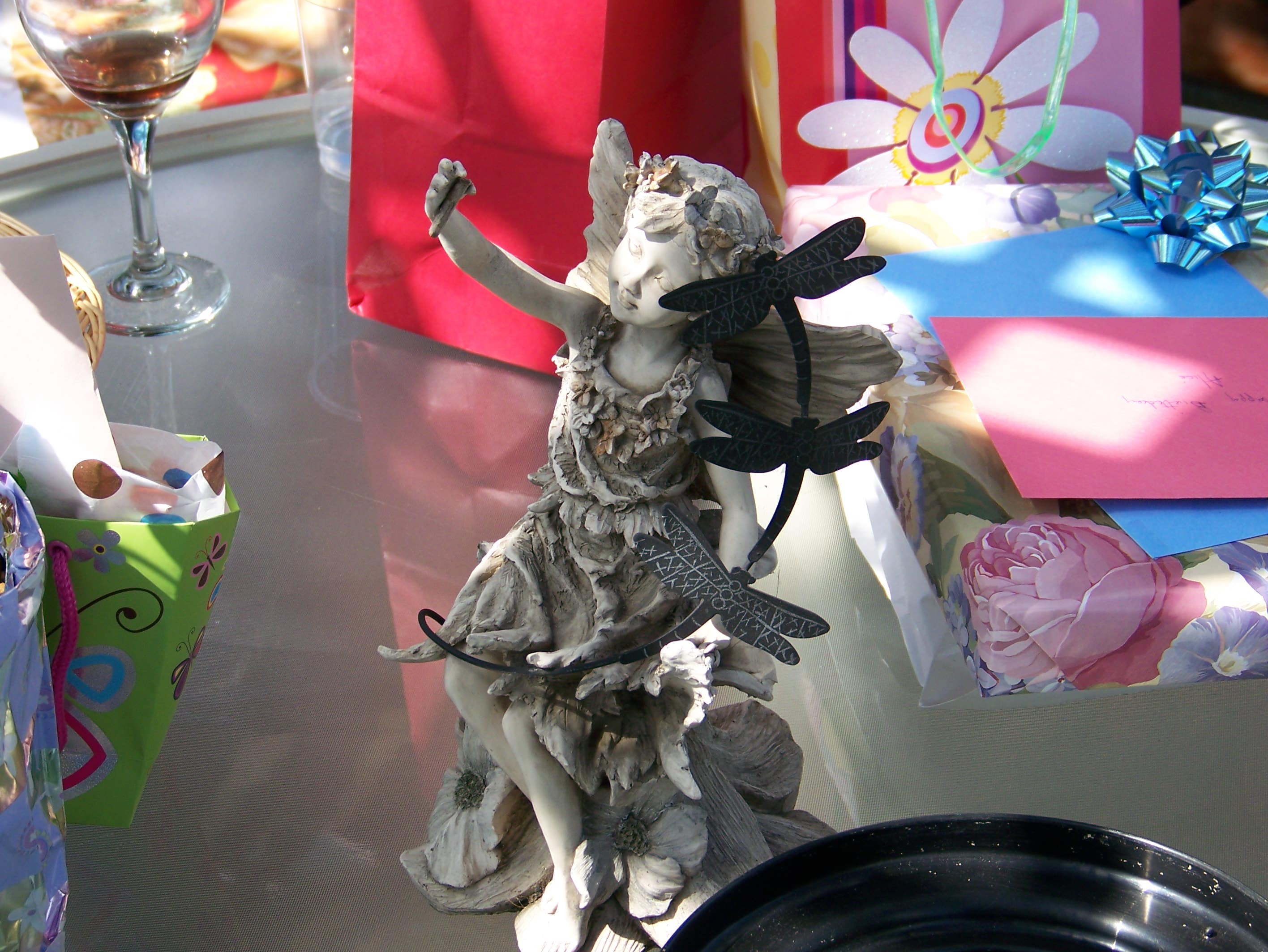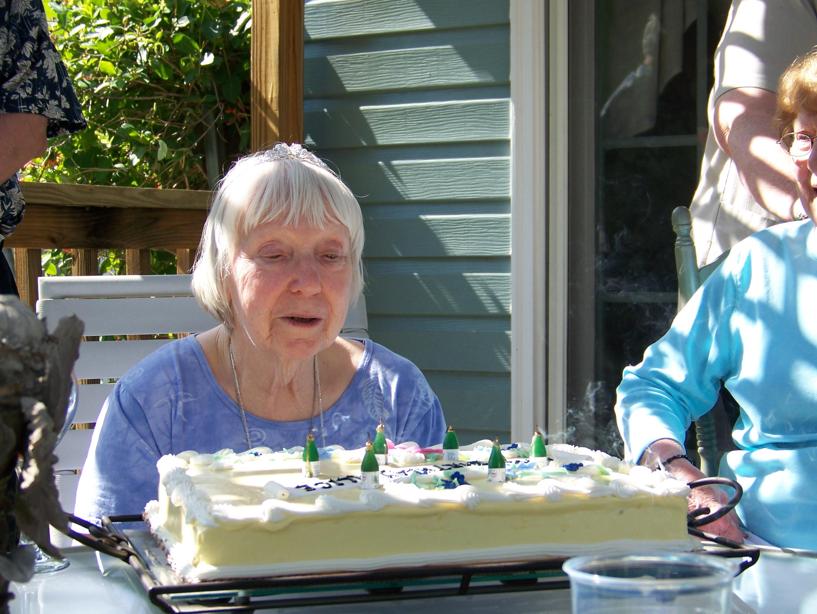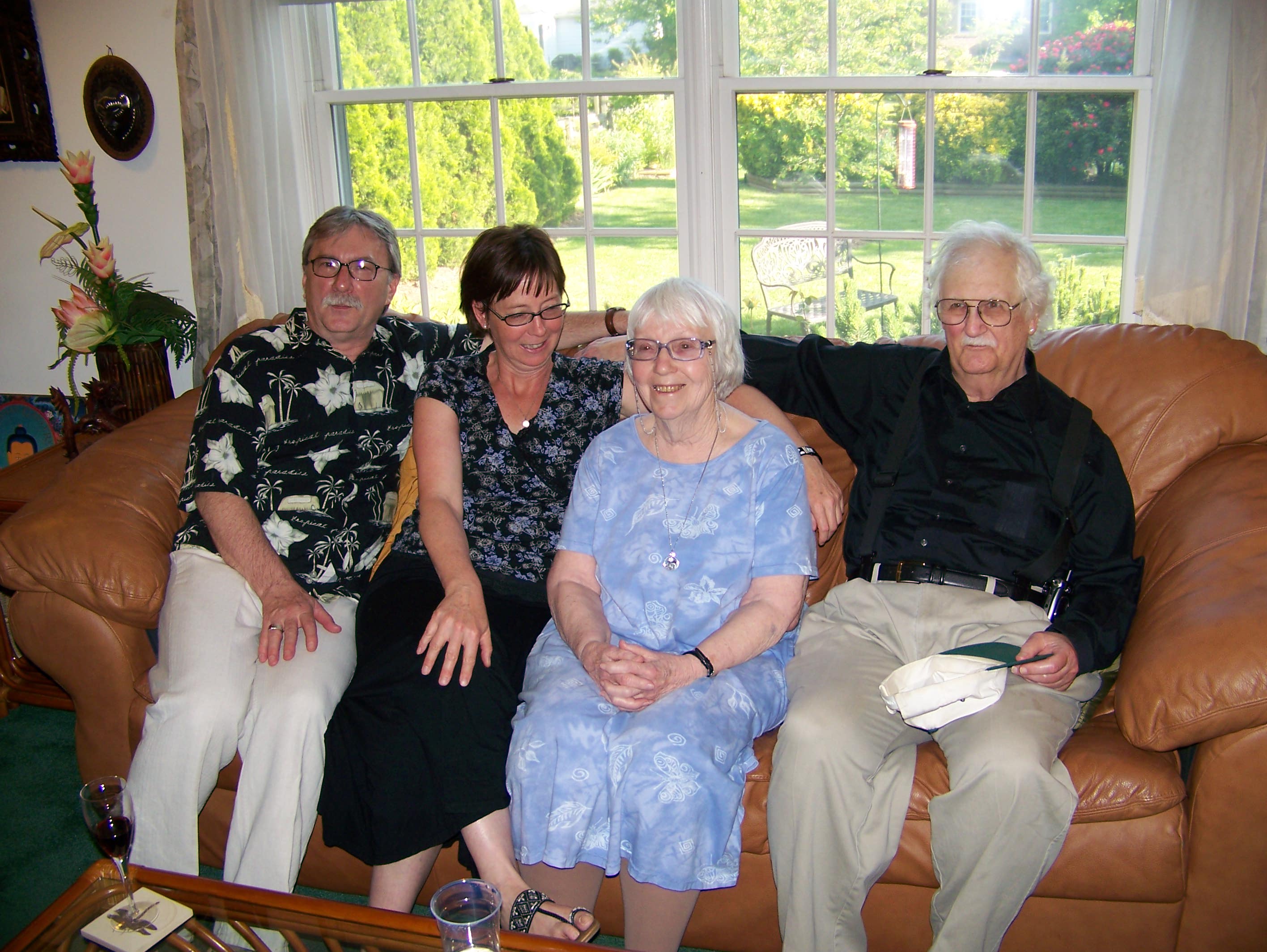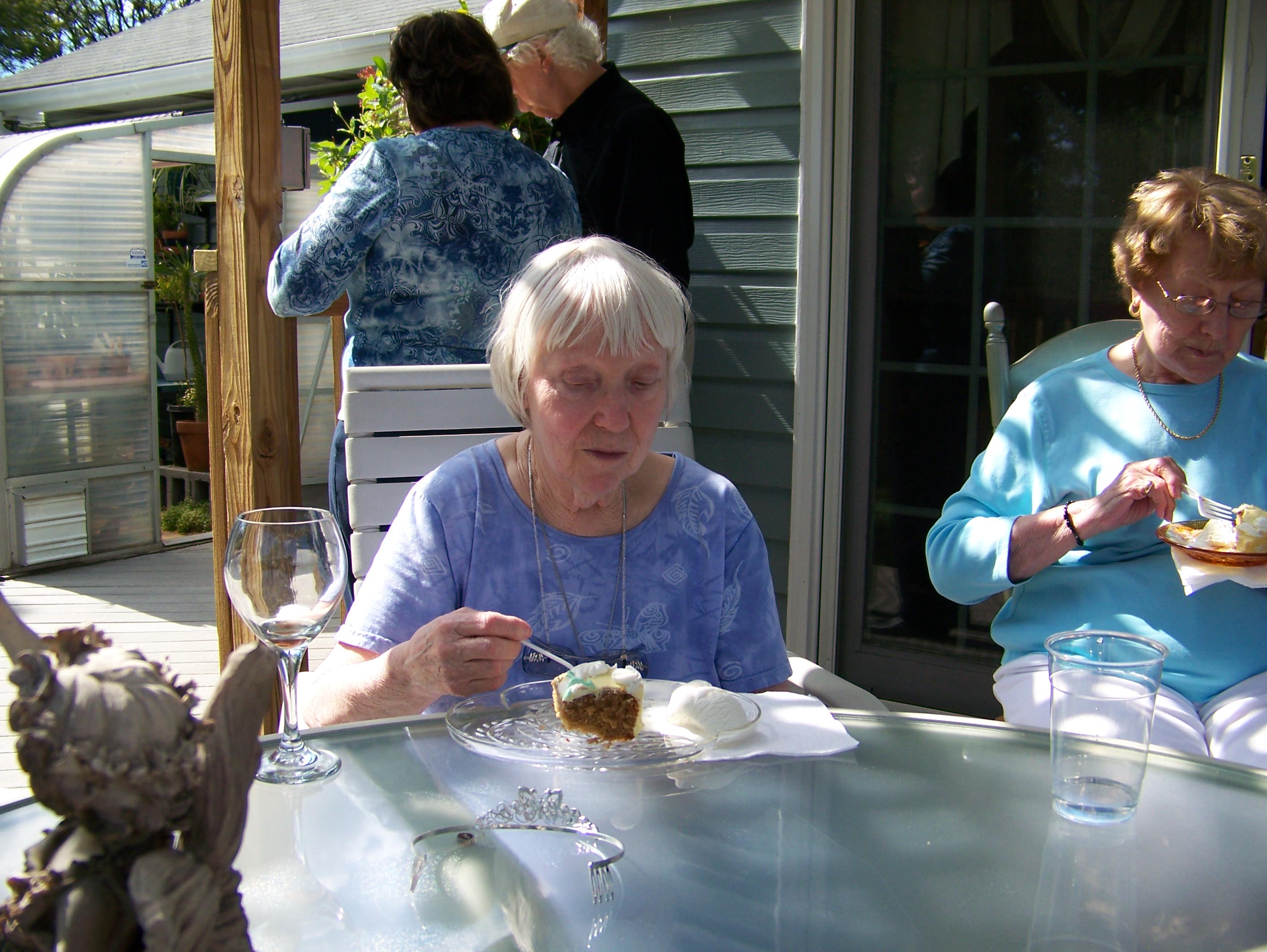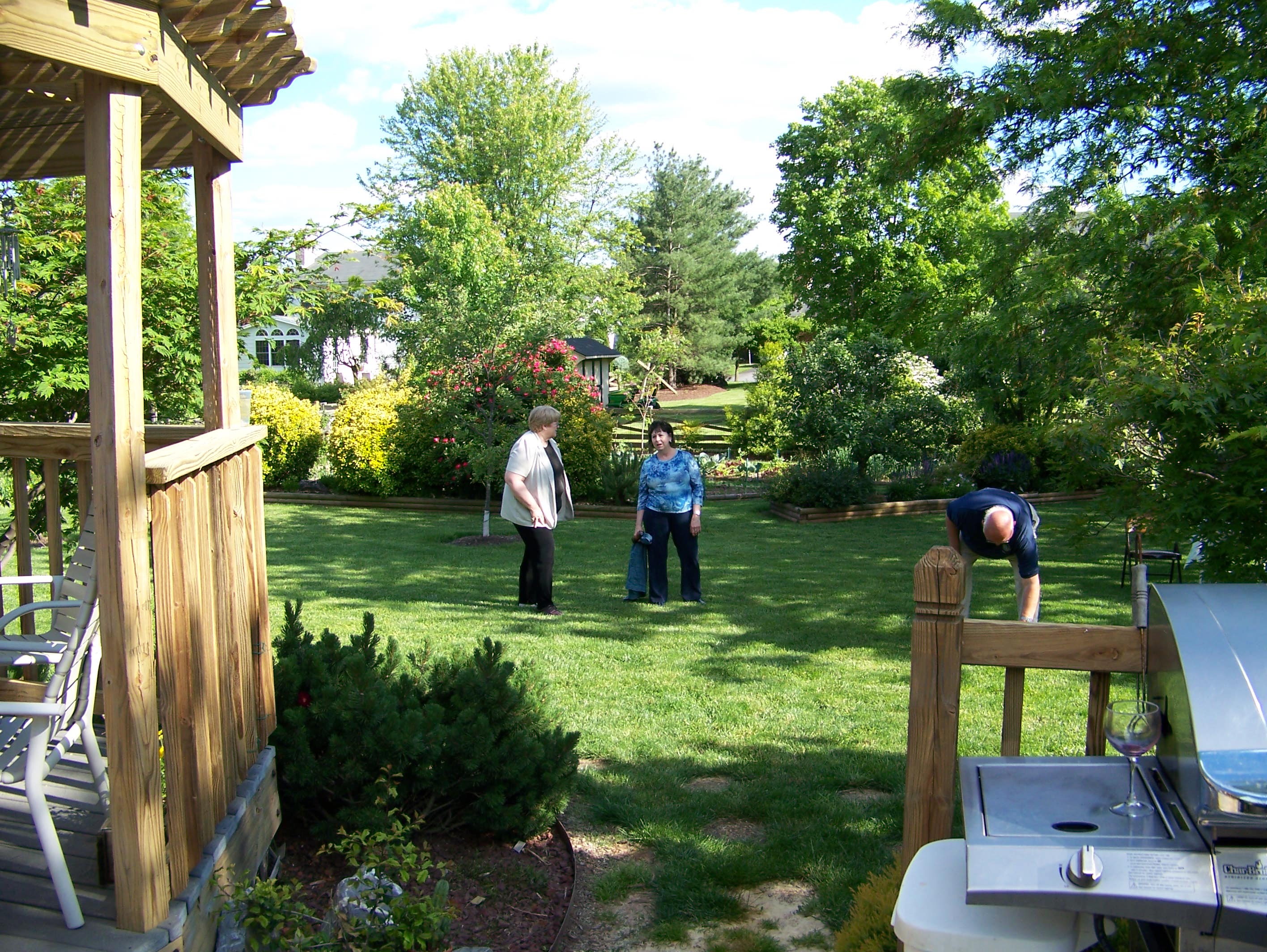 A tour of the garden. Let's get this party started, cause all my rowdy friends are coming over tonight. And Mom opens the gifts. The Hosts really have a green thumb. The neighbors have a wild duck taking to the swimming pool. Mom with friends Mom with Hosts Mom with us. We Love You Mom |